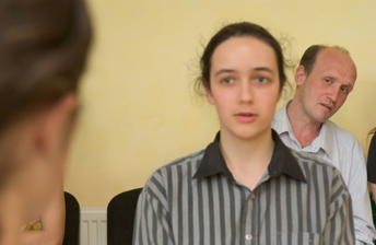 | Mamuka beobachtet den Diskurs zweier Jugendlicher waehrend eines Workshop im Jugendzentrums von Bolnissi, einem von insgesamt vier von World-Vision unterstuetzten unabhaengigen Jugendeinrichtungen in Georgien. Die Jugendlichen agieren in vorgegebenen Rollen und sollen lernen ihre Interessen gewaltlos und frei von Aggressionen zu formulieren. An dem Workshop beteiligen sich Jugendliche unterschiedlicher ethnischer Herkunft. In Georgien leben neben der grusinischen Mehrheit vor allem Armenier und Asserbaidschaner. |