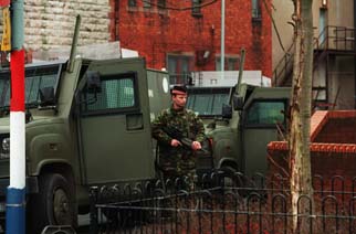 Wachsam: Britische Soldaten postieren sich in der N�he eines Friedhofs, auf dem ein f�hrender protestantischer Paramilit�r begraben wird.