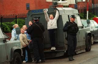 Kinder des Konflikts: W�hrend sich britische Soldaten sich in der N�he eines Friedhofs postieren, auf dem ein f�hrender protestantischer Paramilit�r begraben wird, nutzen die \"Kids\" gepanzerte Fahrzeuge als Kletterger�t.